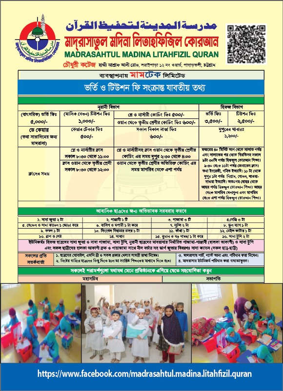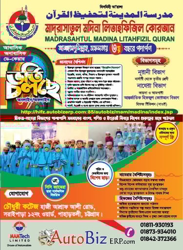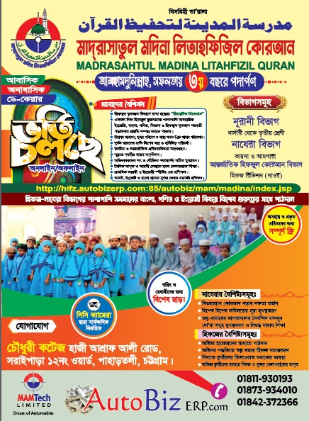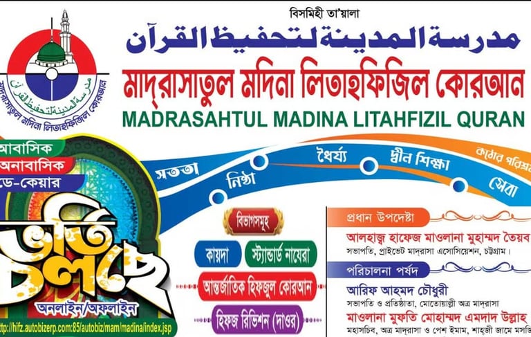 আল-কোরআন: আল্লাহর এক অমূল্য নেয়ামত, মানবজাতির জন্য প্রেরিত শ্রেষ্ঠতম জীবনবিধান। এই পবিত্র গ্রন্থের আলোকিত বার্তা সর্বত্র ছড়িয়ে দেওয়ার মহৎ উদ্দেশ্যকে সামনে রেখে, আমরা প্রতিষ্ঠা করেছি এক ব্যতিক্রমী দ্বীনি শিক্ষা প্রতিষ্ঠান— মাদরাসাতুল মদিনা লিতাহফিজিল কোরআন।